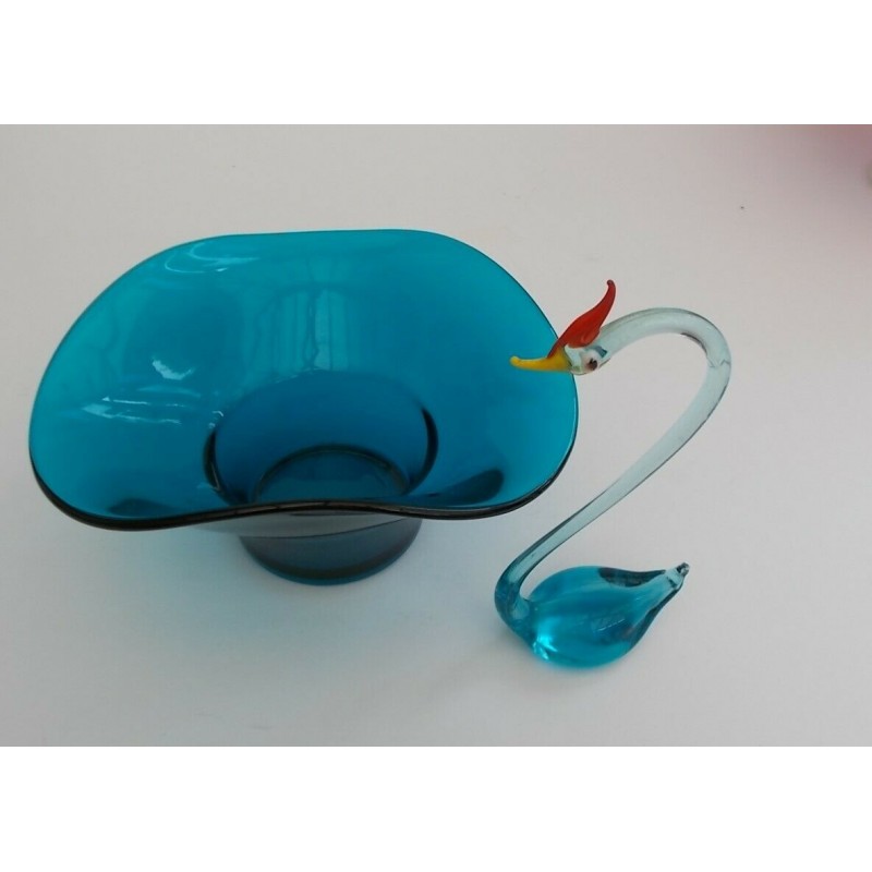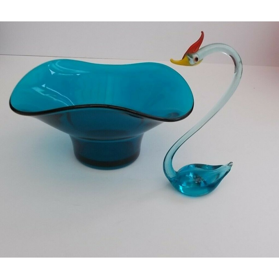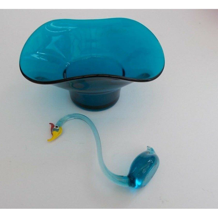 Vintage Retro 1960's Hand Made Art Glass Swan and Blue Glass Bowl.