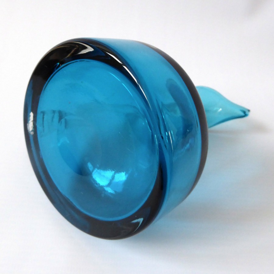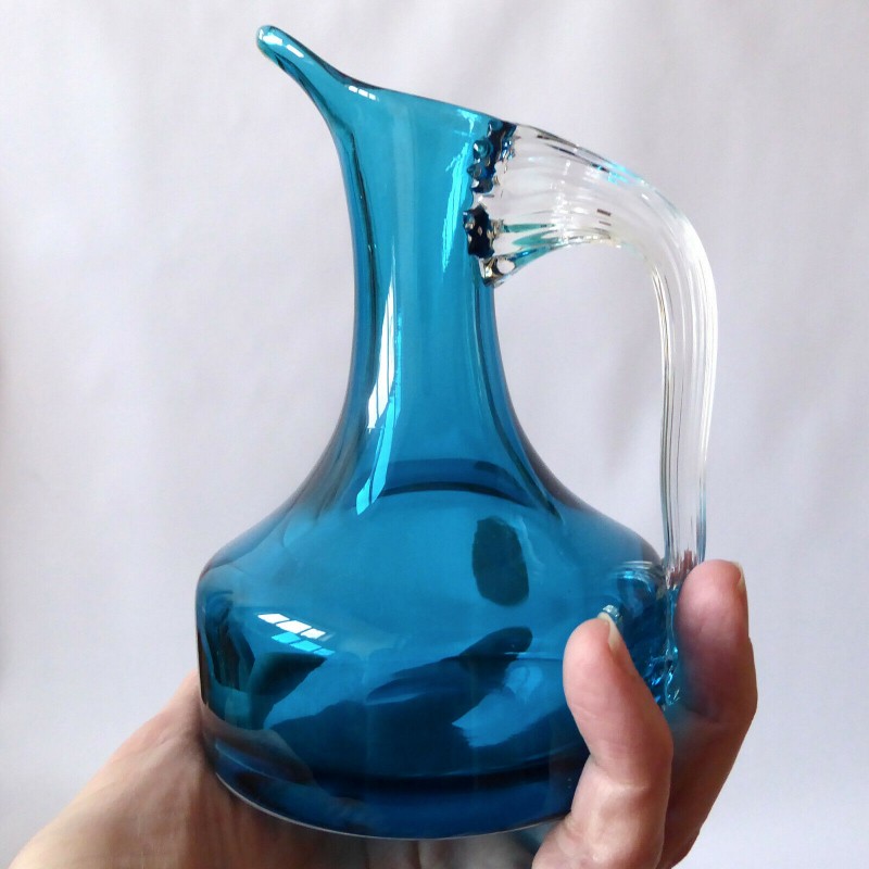 Great vivid Kingfisher colouring with cased base and elegant clear handle and distinctive pointy spout. 5.5" tall - making it the smaller one, the larger one is 9718 and a bit taller. Excellent condition. It does have a sharp pointy bit at the end of the spout from time of manufacture/finishing, see pics. No chips or marks, really good, circa 1970s vintage. |